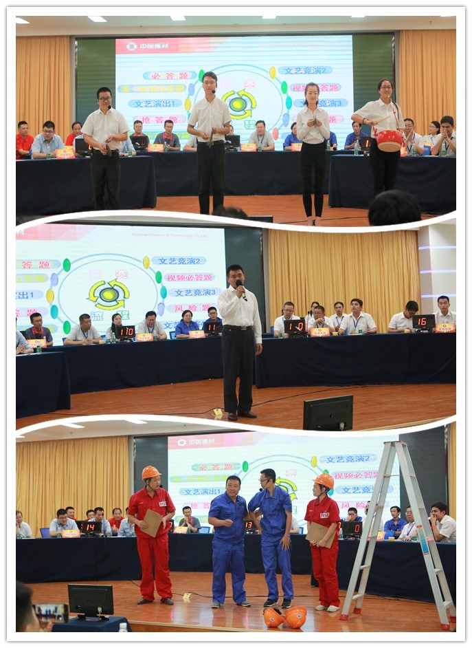 本次競賽,由各單位推薦選送共有9支代表隊參賽,分別是中材葉片、泰山玻纖本部、泰山玻纖子公司、中材鋰膜、南玻有限、北玻有限、蘇非有限、蘇州有限、成都有限代表隊,代表隊成員分別由安全管理人員、生產(chǎn)管理人員、工藝技術(shù)人員3人組成。比賽采取必答題環(huán)節(jié)、搶答題環(huán)節(jié)、風險題環(huán)節(jié),限時進行答題,競賽內(nèi)容涵蓋安全法律法規(guī)、操作規(guī)程、安全管理等方面知識,同時在比賽現(xiàn)場還增加觀眾互動答題環(huán)節(jié)和安全文藝演出,職工自編自演的“安全三句半”、“祝你平安演講”、安全小品等,贏得了現(xiàn)場職工的陣陣掌聲。