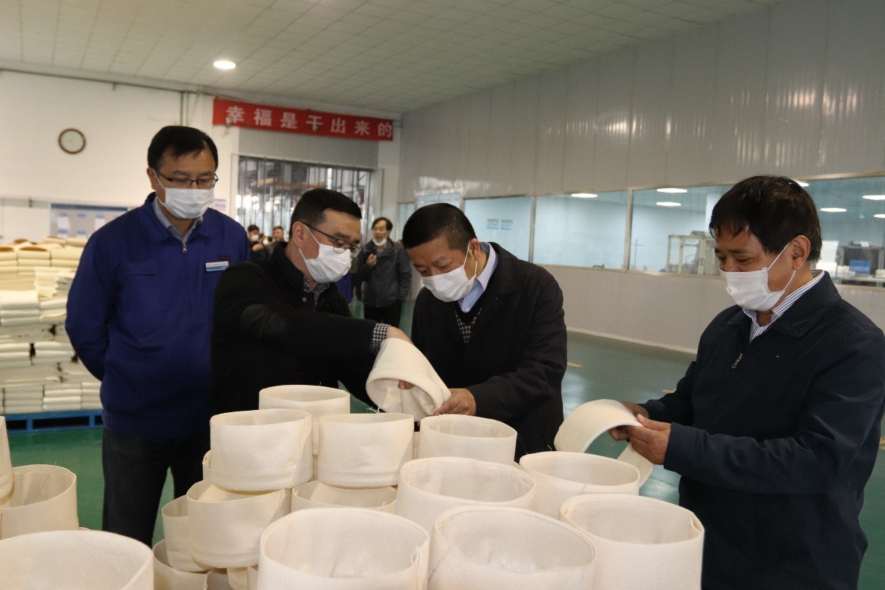 蔡國(guó)斌一行參觀了膜材山東公司兩個(gè)生產(chǎn)車間。在調(diào)研過程中,中材科技膜材料公司副總經(jīng)理、膜材山東公司總經(jīng)理項(xiàng)朝衛(wèi)對(duì)整個(gè)生產(chǎn)工藝、裝備產(chǎn)能、人員配置做了詳細(xì)介紹,并著重介紹了膜材料公司專業(yè)從事袋式除塵用過濾材料產(chǎn)品的研發(fā)、生產(chǎn)和市場(chǎng)開拓。