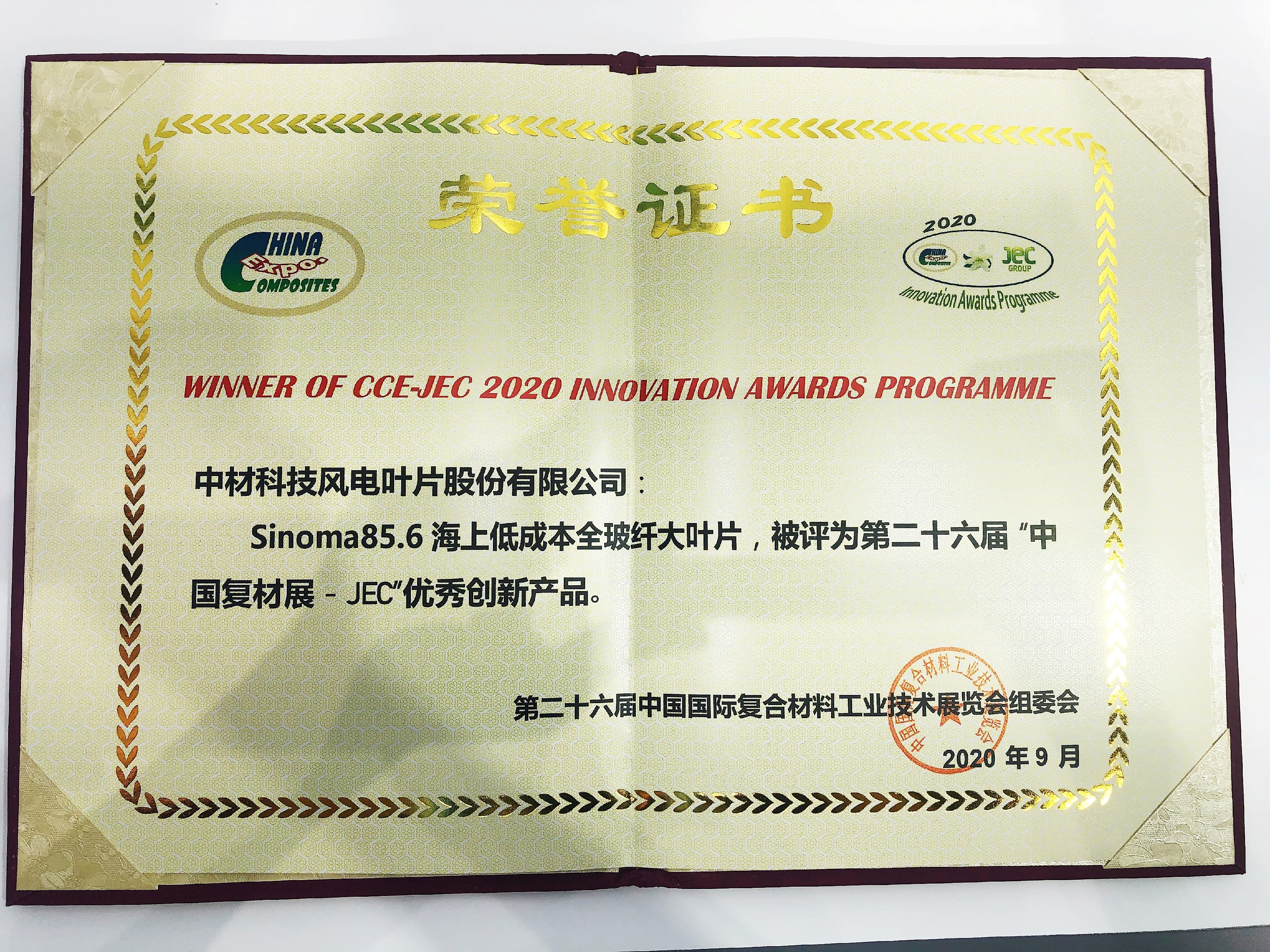 9月2日上午11點(diǎn),在世博館2號館的新聞發(fā)布區(qū)舉行了隆重的2020 CCE-JEC創(chuàng)新產(chǎn)品頒獎儀式,來自國內(nèi)外34家企業(yè)的44件創(chuàng)新產(chǎn)品角逐原材料、應(yīng)用、工藝技術(shù)及設(shè)備三大類9項大獎。中材科技風(fēng)電葉片股份有限公司的參展產(chǎn)品“Sinoma85.6海上低成本全玻纖大葉片”被評為第二十六屆“中國復(fù)材展-JEC”優(yōu)秀創(chuàng)新產(chǎn)品獎。公司董事長薛忠民參加了頒獎儀式。